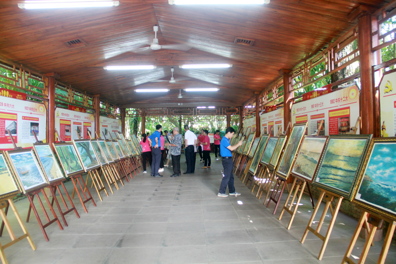 此次画展是展示香饮所归侨热爱祖国的赤子情怀,宣扬香饮所共产党员一心向党的政治品质,营造百花齐放的创新文化氛围,以实际行动向建党100周年献礼的重要活动之一。展出时间为6月18日至7月17日,共展出林民富老专家的51幅油画作品,分为“香饮所四大经济作物”、“奇特热带植物”“美丽乡愁”“魅力海南岛”等四个板块。当天展馆内人头攒动,所职工、市民游客认真欣赏一幅幅各具特色的画作。作品栩栩如生,笔触细腻,以艺术的视角,用斑斓的色彩绘下大美海南、兴隆热带植物园的大美植物和记忆中的故乡,其一笔一画、一景一物都包含着香饮所老同志们对党对祖国对香饮所的深情,浸润着对生活积极向上的追求和美好未来的向往。
