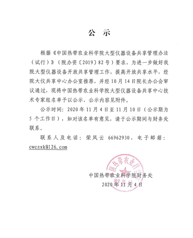 当前位置: 首页 » 通知公告 » 重要通知 中国热科院大仪共享中心技术专家组名单公示 来源:中国热带农业科学院 作者: 财务处 点击数: 次 发布时间:2020-11-04 我要分享 打印 【字体: 大 中 小 】