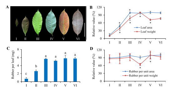 图1 不同发育阶段橡胶树叶片中橡胶的特征描述